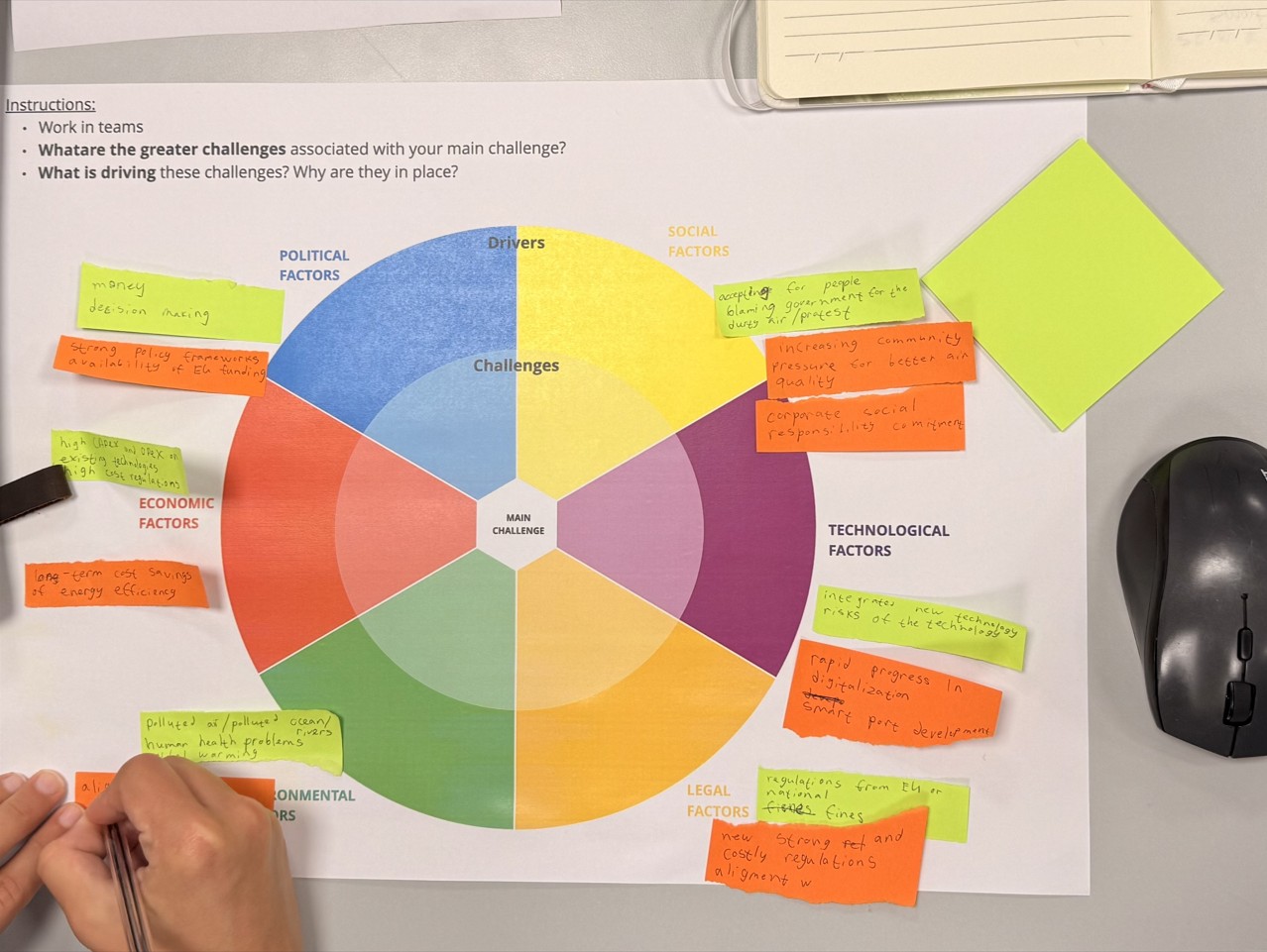 The second workshop centred on Systems Thinking and Design Thinking with AI integration, with a focus on using structured frameworks to navigate complex maritime problems. Through the Pentagonal Problem Canvas, participants examined interconnected factors such as resource constraints, technical limitations, societal impacts, climate considerations, and the core problem definition. The integration of Artificial Intelligence in design and decision-making processes was also highlighted, demonstrating how data-driven insights can support more robust maritime innovation.